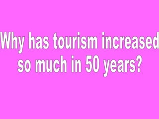 This document provides information about preparing for an exam on tourism impacts. It discusses what the exam theme and focus will be, when it is, and how much it contributes to the overall grade. It then asks questions to help define key tourism terms and identify stakeholders. Charts and maps show patterns in global tourism destinations and spending. Questions prompt identifying these patterns and trends. The document suggests tourism has greatly increased since 1960 and asks why. It also asks about different types of jobs involved in the tourism industry and provides example exam questions on impacts and events affecting tourism levels. Homework involves researching UK tourism sites, volumes, and potential effects.