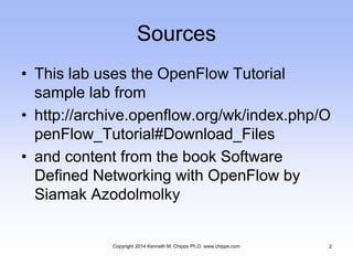 This document provides instructions for using Mininet and the POX controller to simulate a software-defined networking (SDN) environment. It describes downloading a virtual machine appliance containing Mininet and checking the Linux setup. It then explains how to use Mininet to create a simple network topology with hosts, switches, and links. Basic OpenFlow commands are demonstrated like adding flows manually and viewing flow tables. Finally, it shows how to activate Wireshark for examining OpenFlow traffic.