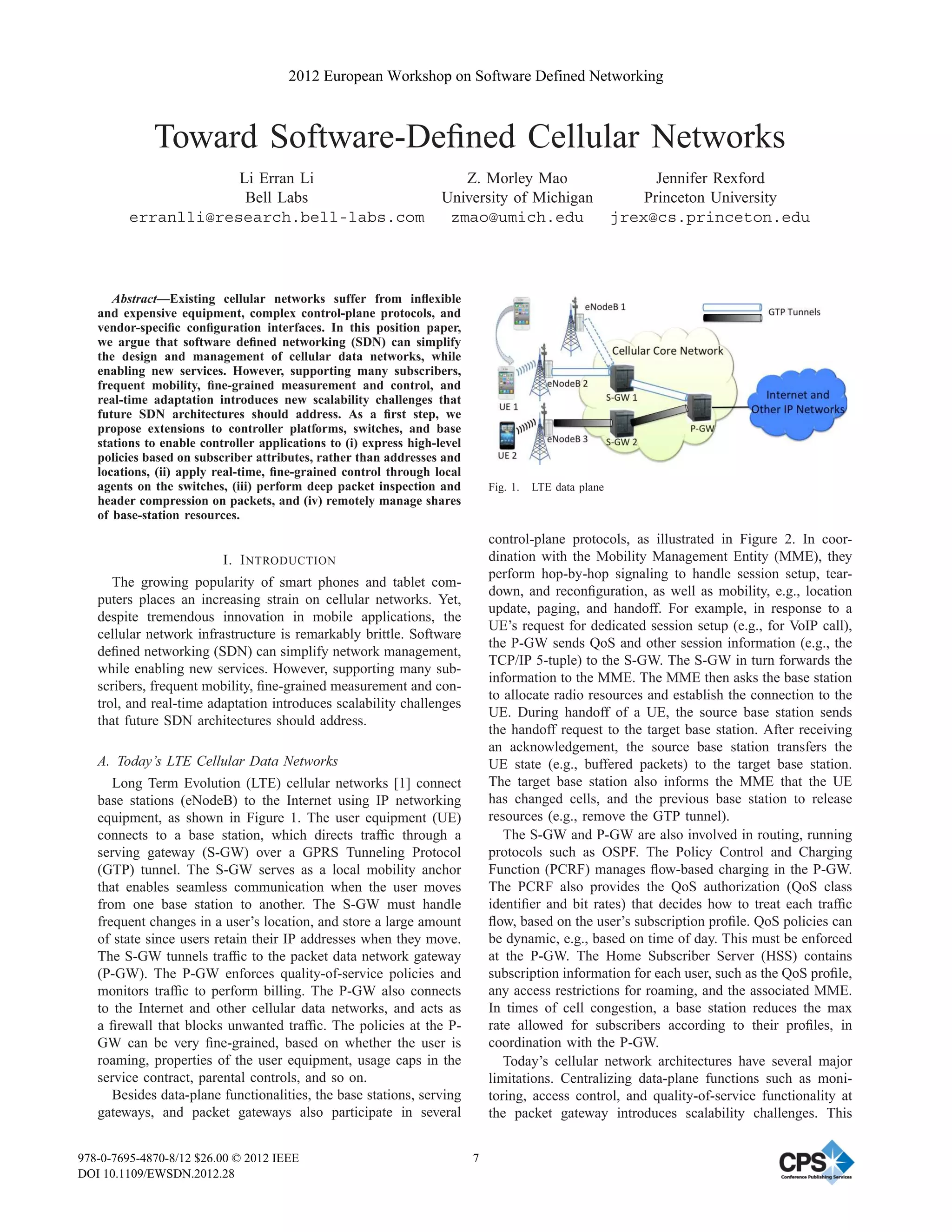 The document discusses how software defined networking (SDN) could be applied to cellular networks to simplify network management and enable new services. It proposes several extensions to SDN controllers, switches, and base stations to address challenges in supporting mobility, scalability, and real-time control in cellular networks. Specifically, it suggests expressing policies based on subscriber attributes rather than addresses, using local switch agents for real-time control, and enabling remote control of virtualized base station resources from the SDN controller.