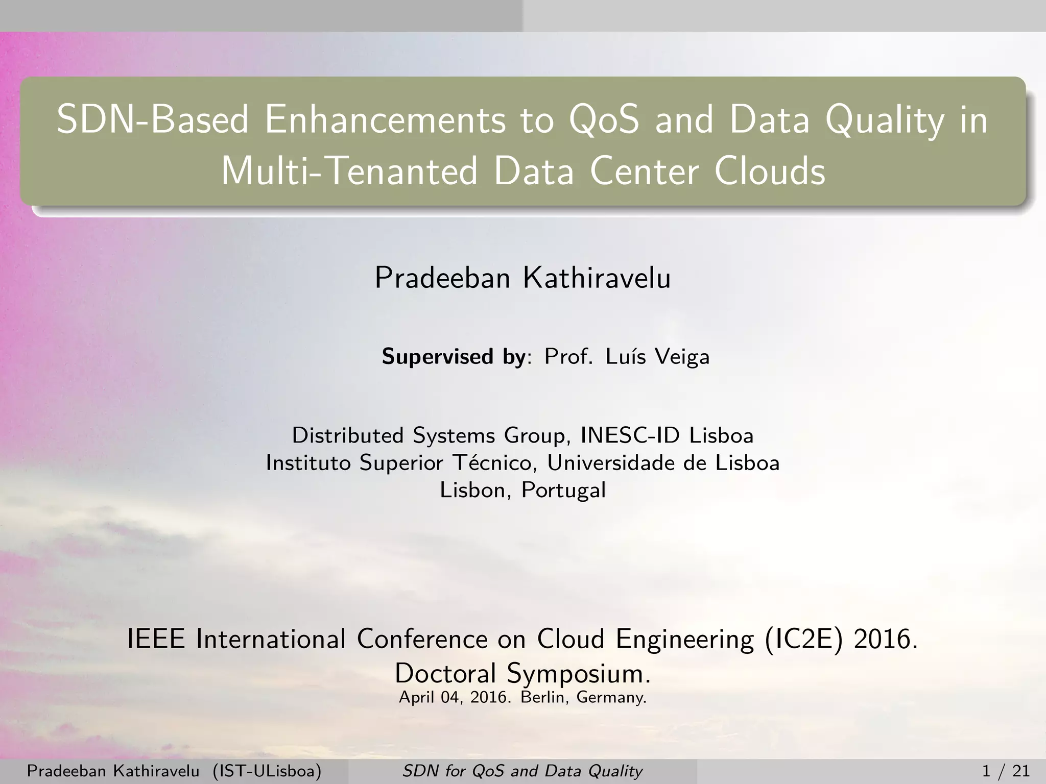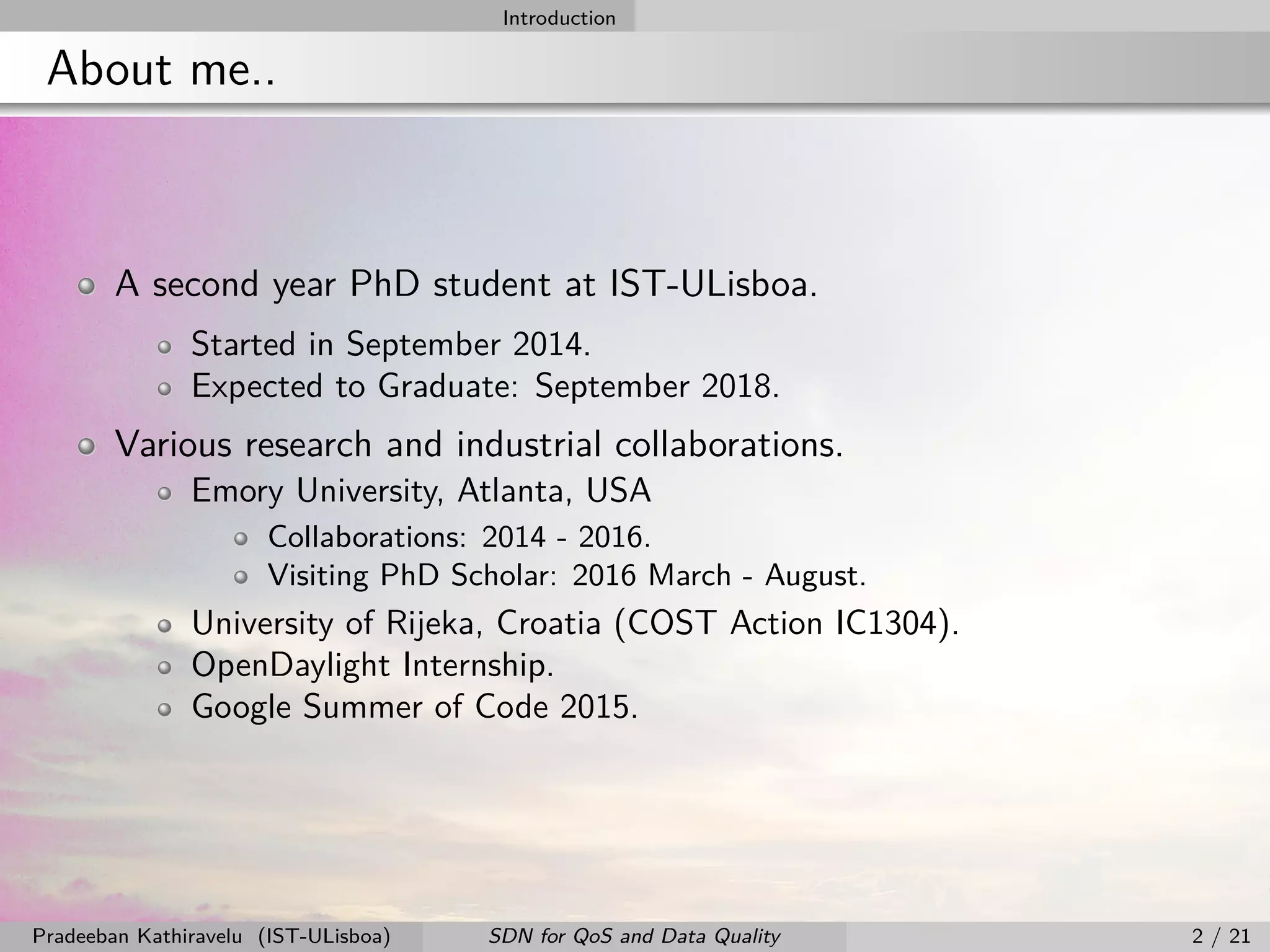 Pradeeban Kathiravelu is a PhD student researching how to use SDN to improve QoS and data quality in multi-tenant data center networks. His approach is to deploy an extended SDN controller architecture to increase QoS and enhance data quality for stored and processed data. He has published several papers on this topic and ongoing work includes the SMART project, with promising results showing improved data isolation, quality, and QoS guarantees through the use of SDN.