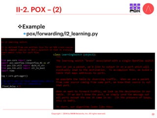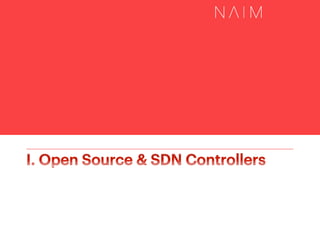 The document presents an overview of open source software-defined networking (SDN) controllers, highlighting their significance and potential for innovation within the networking space. It details various open source SDN controllers, their features, and development environments, emphasizing community contributions and accessibility. The content reflects on the benefits of separating the control and forwarding planes, as well as the evolution of several SDN controller projects.