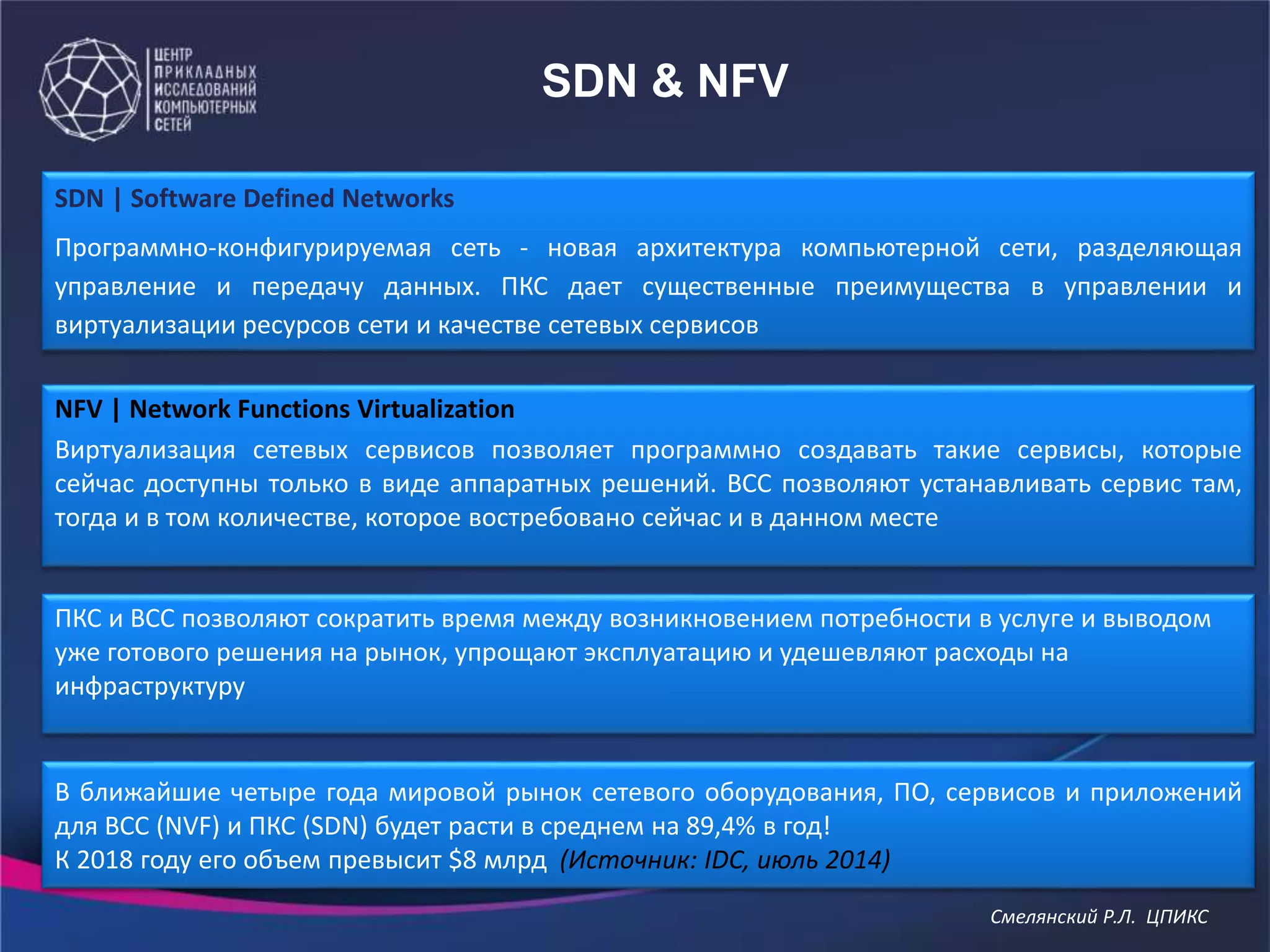 Документ описывает программно-конфигурируемые сети (SDN) и виртуализацию сетевых функций (NFV) как новые архитектуры, которые разделяют управление и передачу данных, позволяя значительно оптимизировать управление сетью и снизить затраты. Ожидается, что мировой рынок оборудования и услуг для SDN и NFV вырастет на 89,4% в год, достигая более 8 миллиардов долларов к 2018 году. Основные преимущества включают быстрое внедрение новых сервисов, снижение потребления электроэнергии и возможность использования стандартного оборудования.