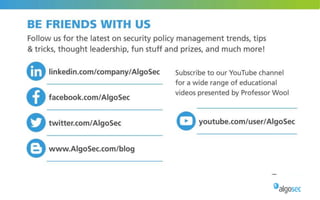The document discusses managing security in software-defined networking (SDN) across various cloud environments, emphasizing the need for proper management to enhance security. It highlights common challenges such as visibility, responsibility blurring, and the importance of consistent security controls across hybrid cloud setups. Recommendations include adopting automation, unified management, and evaluating cloud security controls tailored to specific needs.