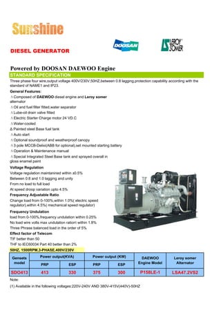 - Components include a DOOSAN DAEWOO engine and Leroy somer alternator.