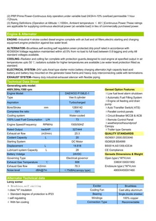 - Technical data is provided on the engine, alternator, control panel, and sound attenuated enclosure.
