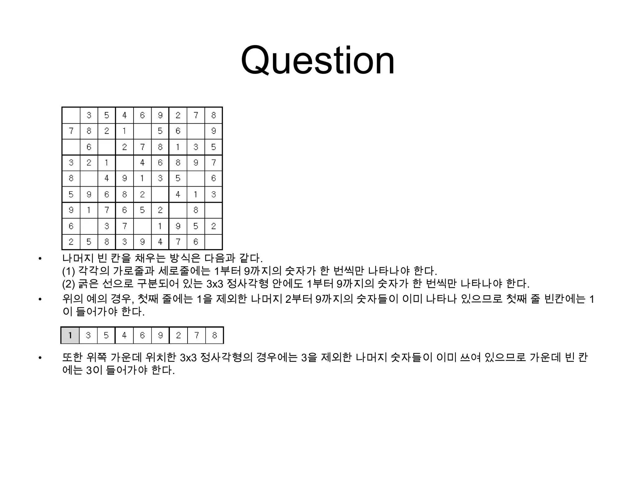 위의 예의 경우, 첫째 줄에는 1을 제외한 나머지 2부터 9까지의 숫자들이 이미 나타나 있으므로 첫째 줄 빈칸에는 1