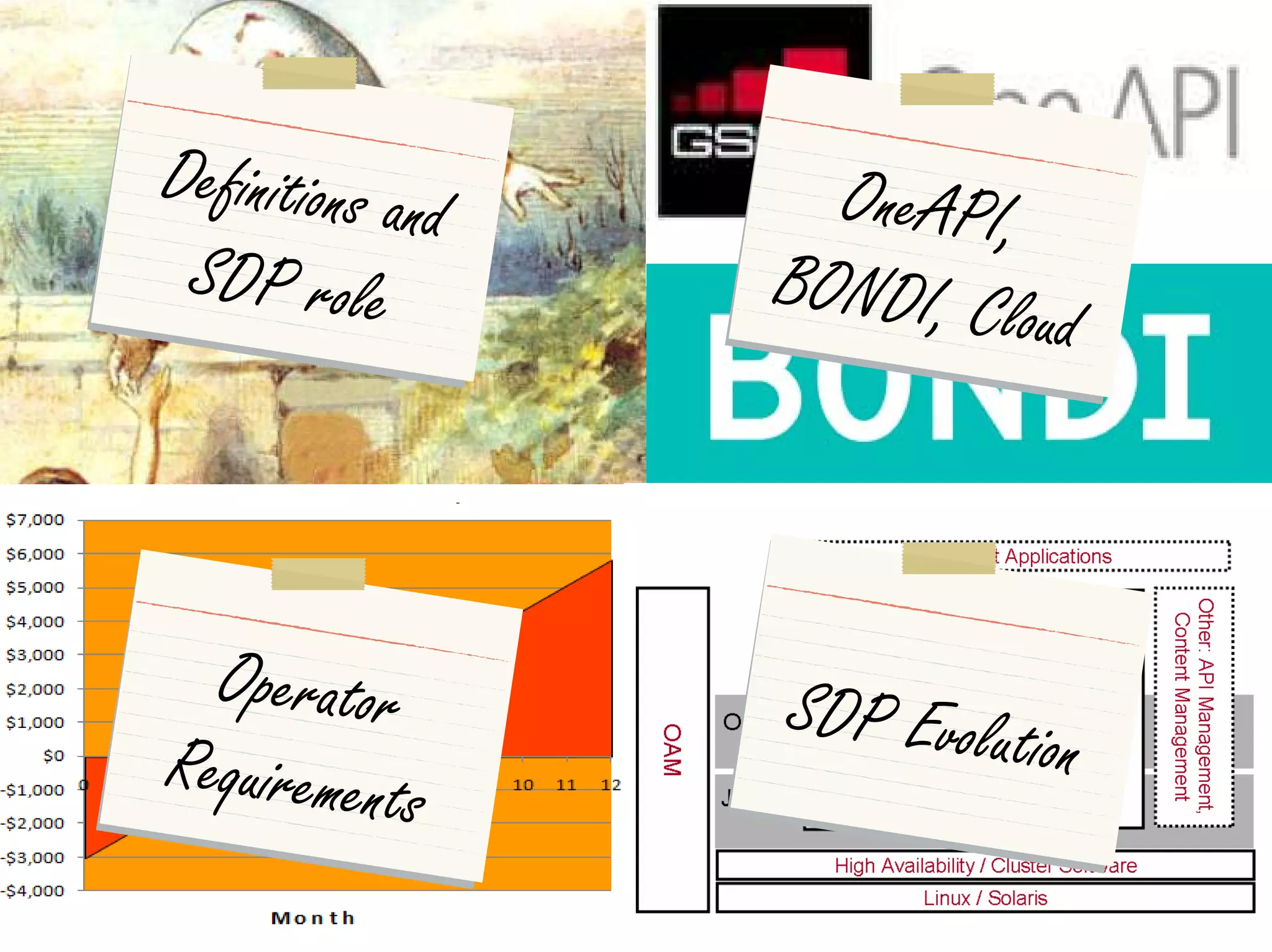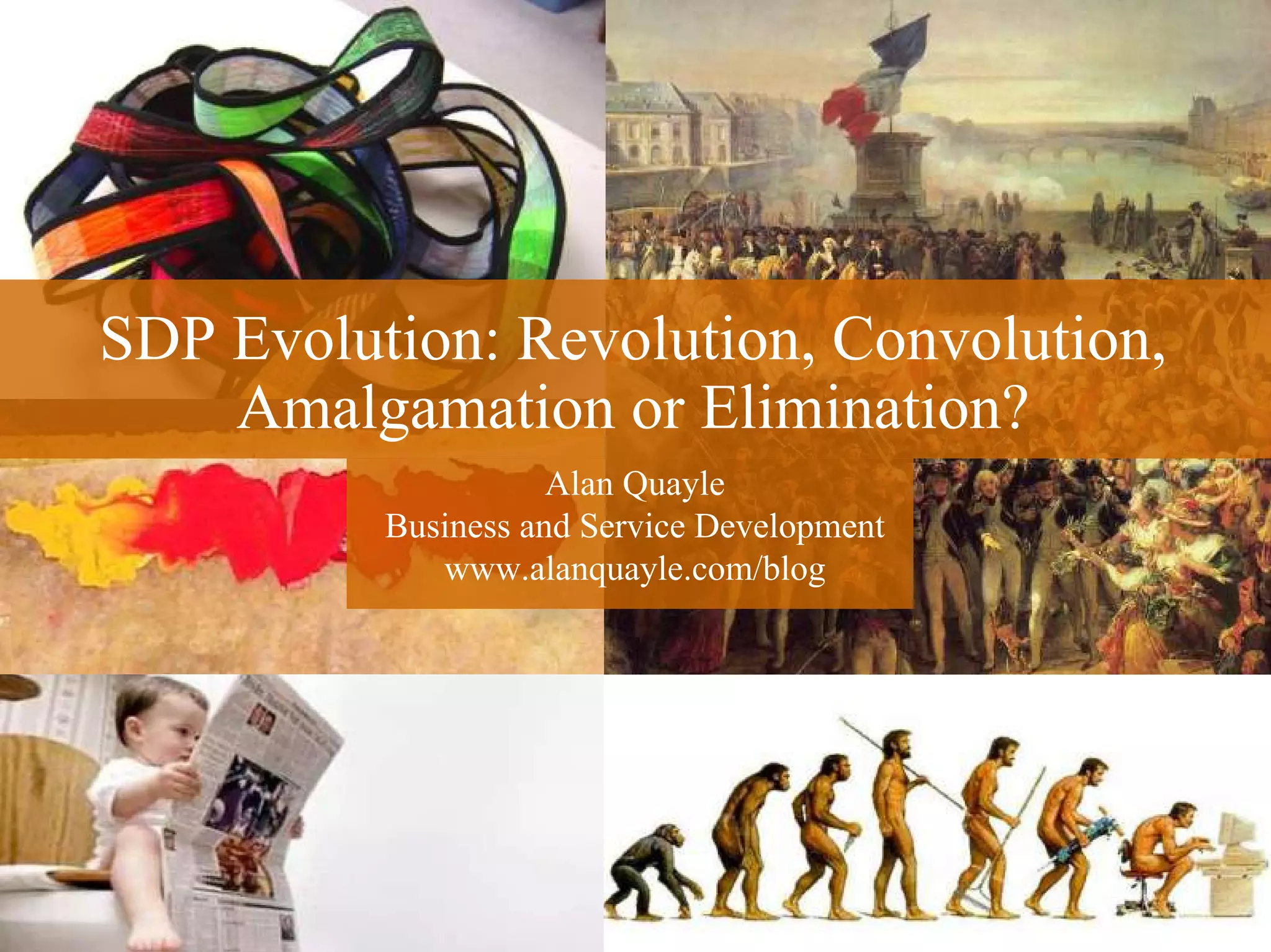 The document discusses the evolution of Service Delivery Platforms (SDP). It notes that SDPs have transitioned from being primarily technology focused to now emphasizing solving business problems for operators. Vendors are evaluated based on the business case for their applications and integration capabilities rather than just technology. The document concludes that changing customer expectations and the feasibility of integrated SDPs now allow for business model decisions regarding SDPs.