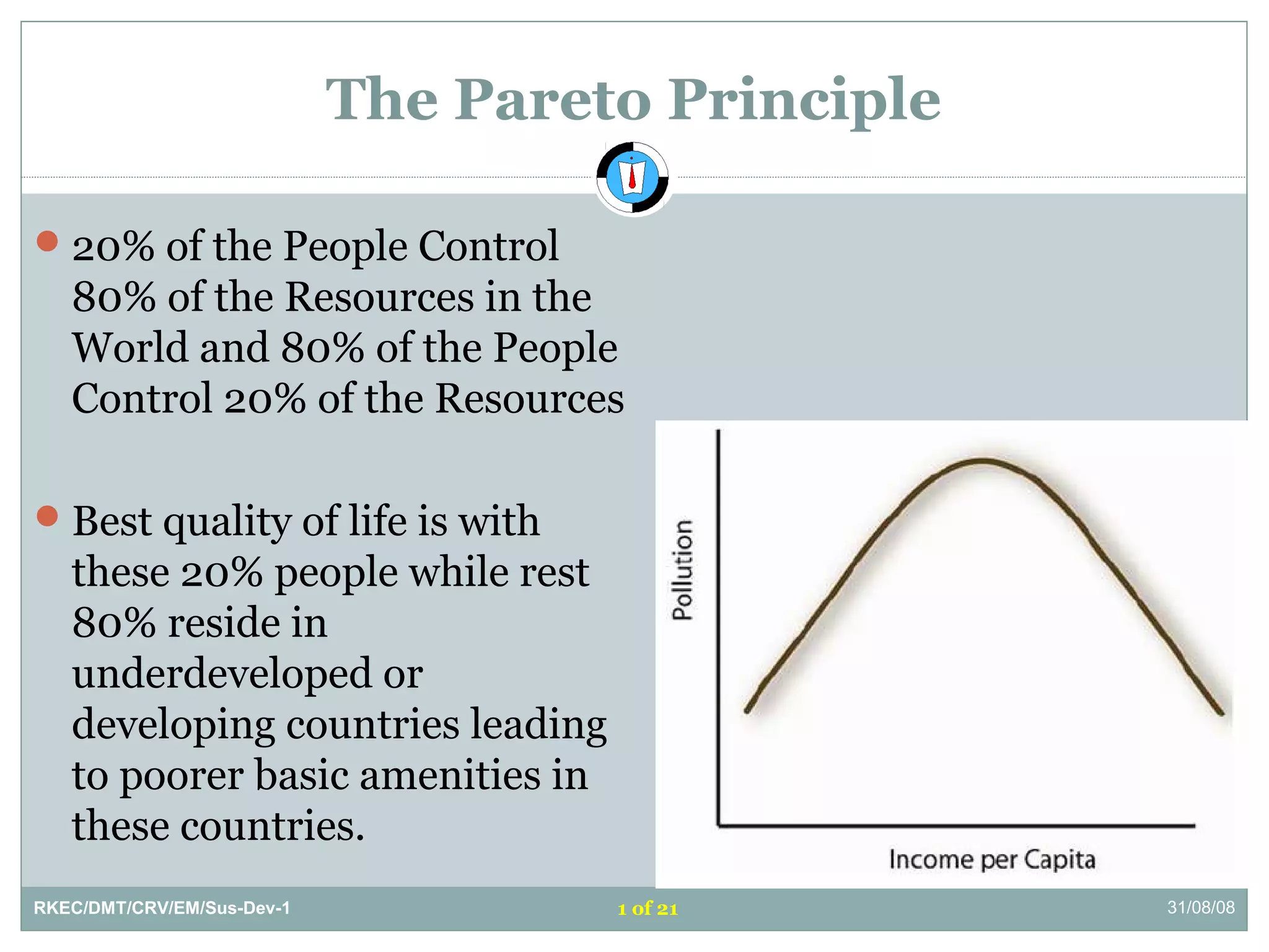The document discusses several topics related to sustainable development. It first discusses the Pareto principle, which notes that 20% of the world's population controls 80% of resources, leading to unequal quality of life. It then lists several environmental damages caused by overconsumption and population growth, such as deforestation, pollution, and loss of biodiversity and natural resources. The term "sustainable development" is defined as development that meets current needs without compromising future generations, as coined by the UN World Commission on Environment and Development. The document also discusses focus areas for sustainable development like green jobs, sustainable cities, and water management.