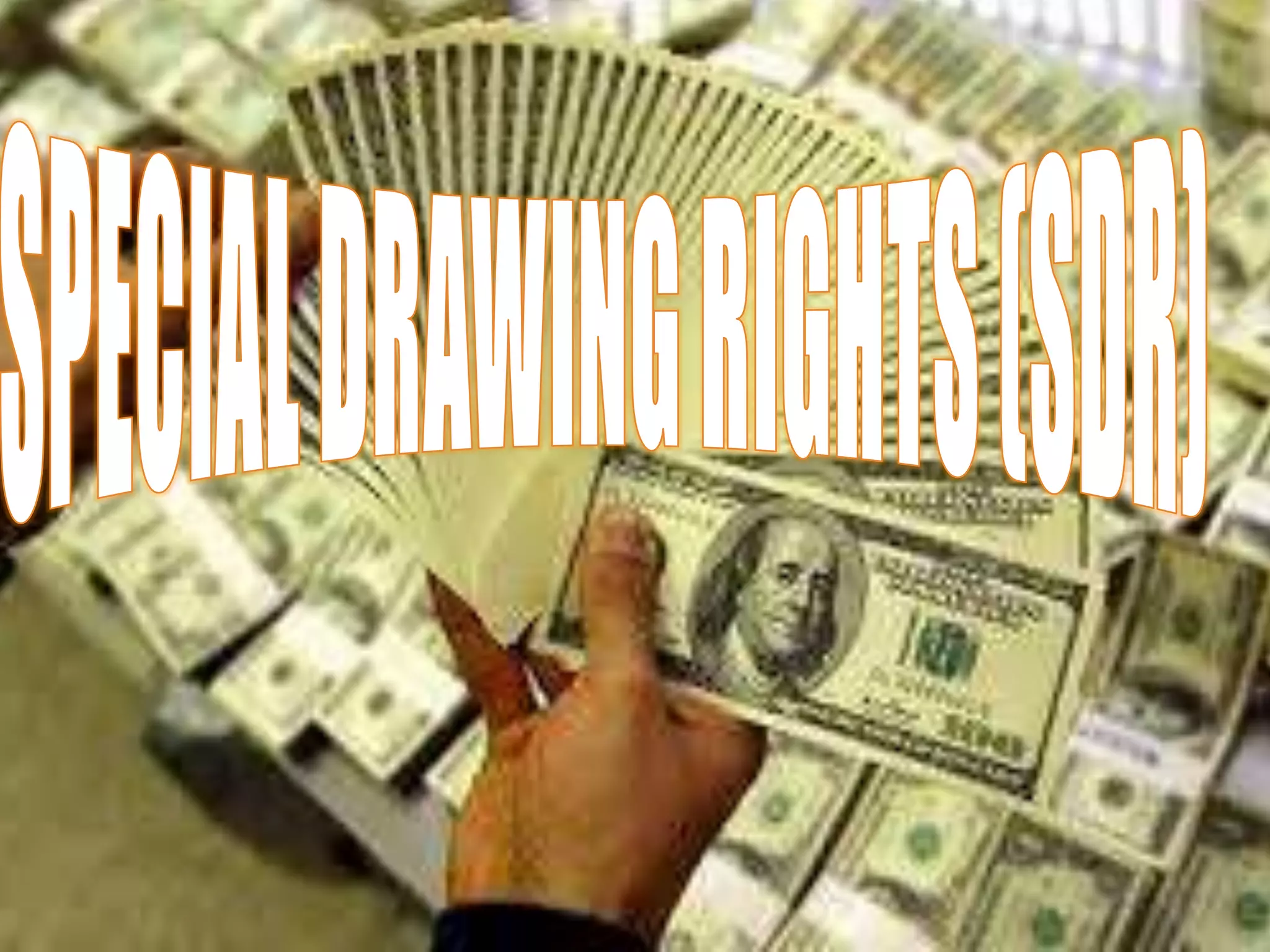 SDRs are international reserve assets created by the IMF to supplement the official reserves of its members. They can be exchanged for freely usable currencies. The value of SDRs is determined by a basket of currencies and is used by IMF members engaging in transactions and for determining interest rates on SDR holdings. While SDRs help improve international liquidity and stability without reliance on gold, some criticize their inequitable distribution and failure to meet liquidity needs or promote development.