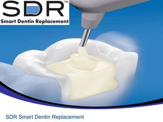 Il documento descrive SDR Smart Dentin Replacement, un innovativo sostituto della dentina che riduce i tempi di intervento del 40% grazie al suo posizionamento in massa autolivellante fino a 4 mm. SDR è progettato per restauri di classe I e II senza necessità di stratificazione, con un basso stress da contrazione e una polimerizzazione controllata. Il materiale offre un eccellente adattamento alla cavità dentale, semplificando le procedure di riempimento.