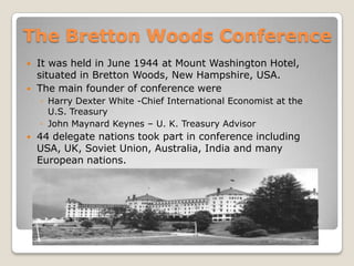 The document provides information about Special Drawing Rights (SDRs) created by the International Monetary Fund. It discusses that SDRs were created in 1969 as a supplemental international reserve asset intended to supplement a shortfall of gold and US dollars. The value of an SDR is defined by a weighted basket of currencies including the US dollar, Euro, British pound, and Japanese yen. SDRs are allocated to IMF members based on their IMF quota and can only be exchanged between central banks for freely usable currencies.