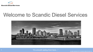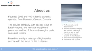 Scandic Diesel Services is a family-owned diesel engine parts and repair company founded in 2009 in Montreal, Canada. They specialize in turbochargers, fuel injection equipment, governors, and two-stroke and four-stroke engine parts sales and repairs. The company aims to provide high quality service with a focus on customer satisfaction and values professionalism, honesty, and innovation.