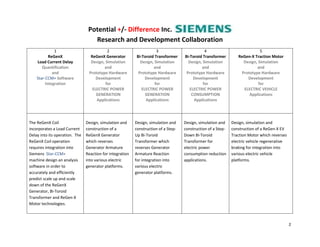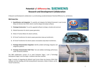 This document outlines a proposed research and development collaboration between Potential Difference Inc. and Siemens. The collaboration would involve two stages: 1) integrating Potential Difference's ReGenX Load Current Delay technology into Siemens' electric machine design software, and 2) using the upgraded software to design, simulate, and construct prototypes of ReGenX generators, motors, and transformers for testing. The goals are to advance technologies for electric power generation, consumption, and electric vehicles. Potential partners for demonstrating and field testing the prototypes are also discussed.