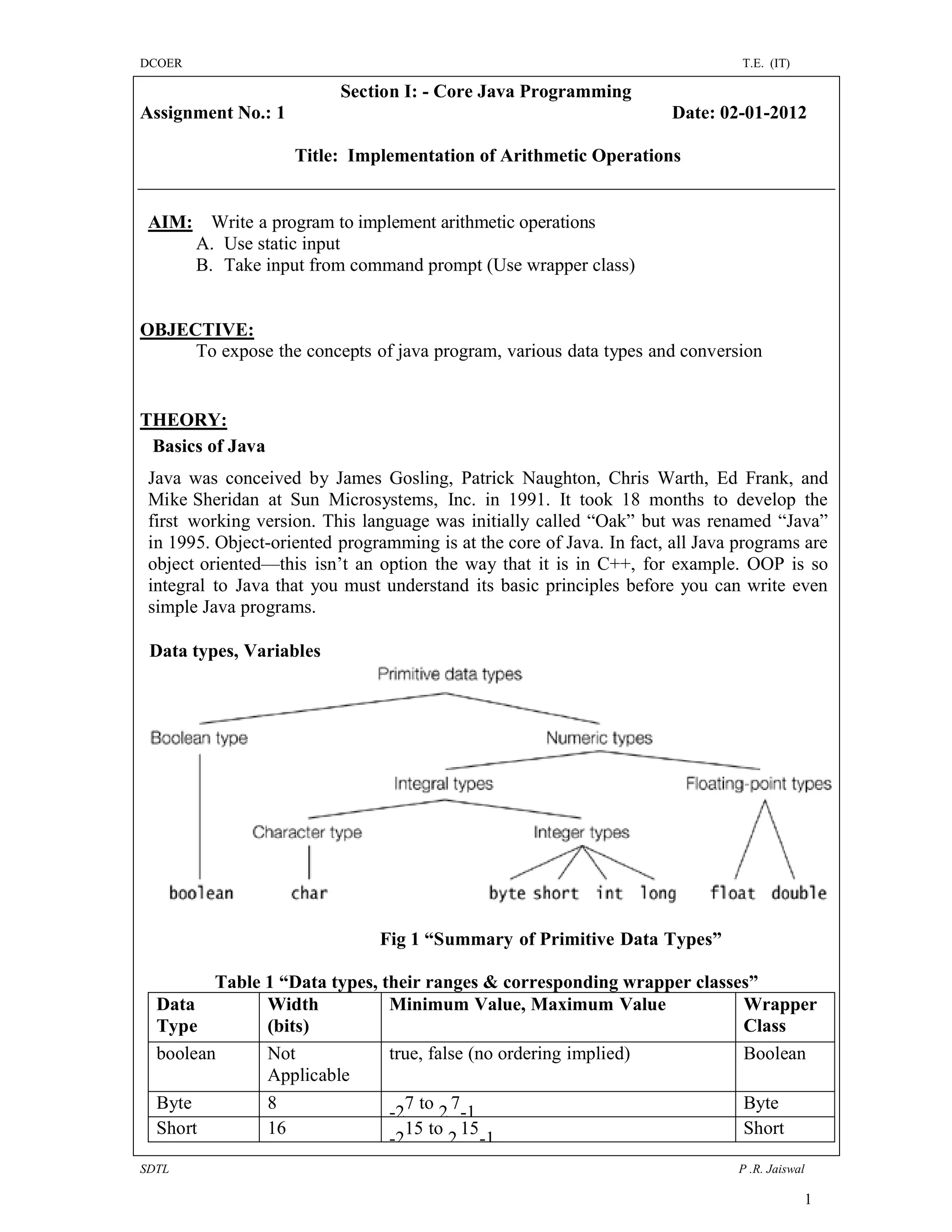 The document discusses core Java programming concepts like data types, variables, wrapper classes, and methods. It provides details on declaring and initializing variables, object reference variables, and the main method. The document also includes frequently asked questions about Java concepts and concludes with an assignment on string operations.