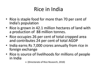 This document provides an overview and future perspective of Livolink Foundation's System of Rice Intensification (SRI) program in India. It summarizes that SRI was piloted from 2007-2009 across 8 states and 105 districts, reaching 65,543 small farmers cultivating 18,685 acres of land. From 2009-2012, the expansion aimed to reach 169,000 farmers across 12 states, achieving 155,000 farmers. Key achievements included 46% increase in yield and 191% increase in income for farmers. The program also led to food security for participating families and increased economic outputs. However, the document notes some failures in engaging state institutions and lack of research partnerships. It concludes that future directions may include intensifying S