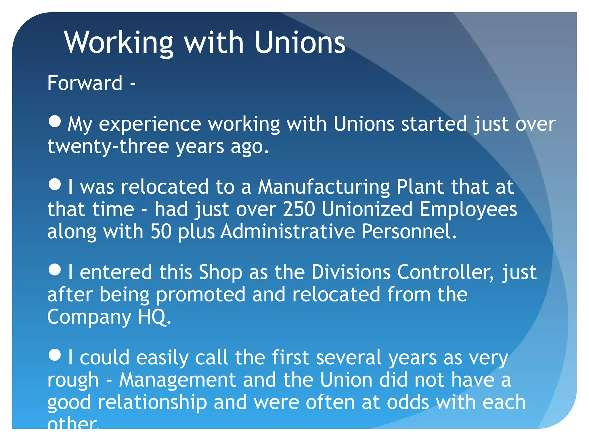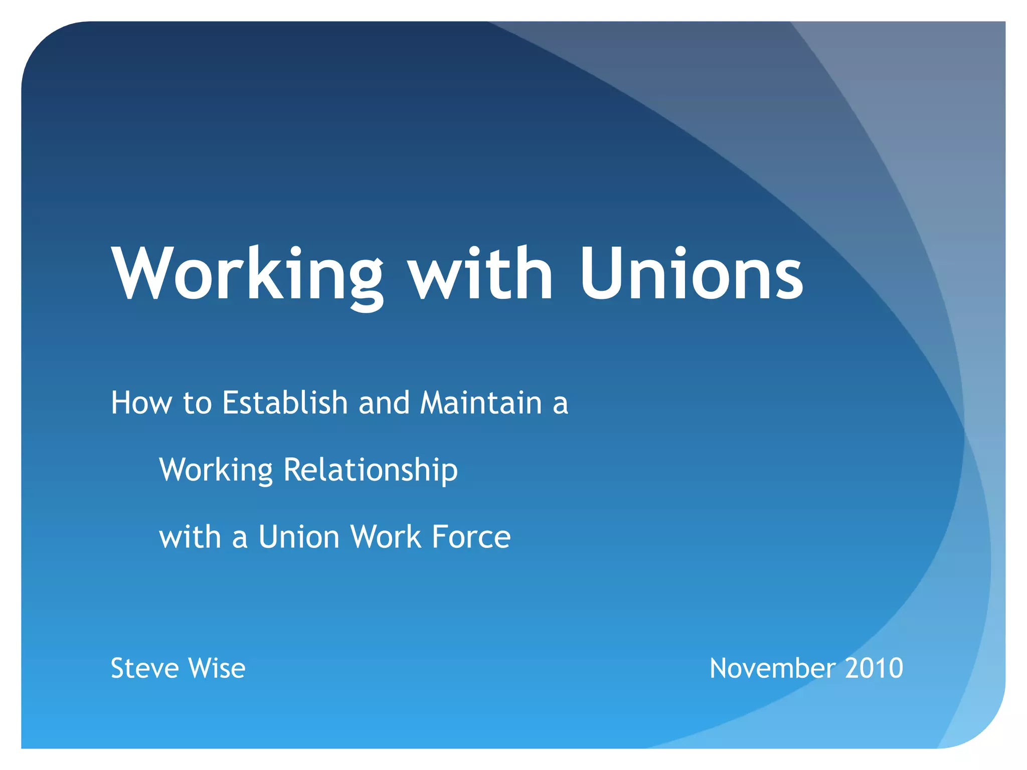 This document provides advice on establishing and maintaining working relationships with unionized workforces. It discusses several key points:
