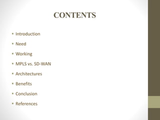 SD-WAN is a newer technology that allows enterprises to access applications and data across various locations more effectively than traditional MPLS networks. It uses software to intelligently direct traffic over multiple internet connections based on priority, quality of service, and security requirements. There are several SD-WAN architectures including on-premises only, cloud-enabled, and cloud-enabled with a private backbone. Companies are switching to SD-WAN for benefits like improved security, centralized management, network visibility, scalability, and lower costs compared to MPLS.