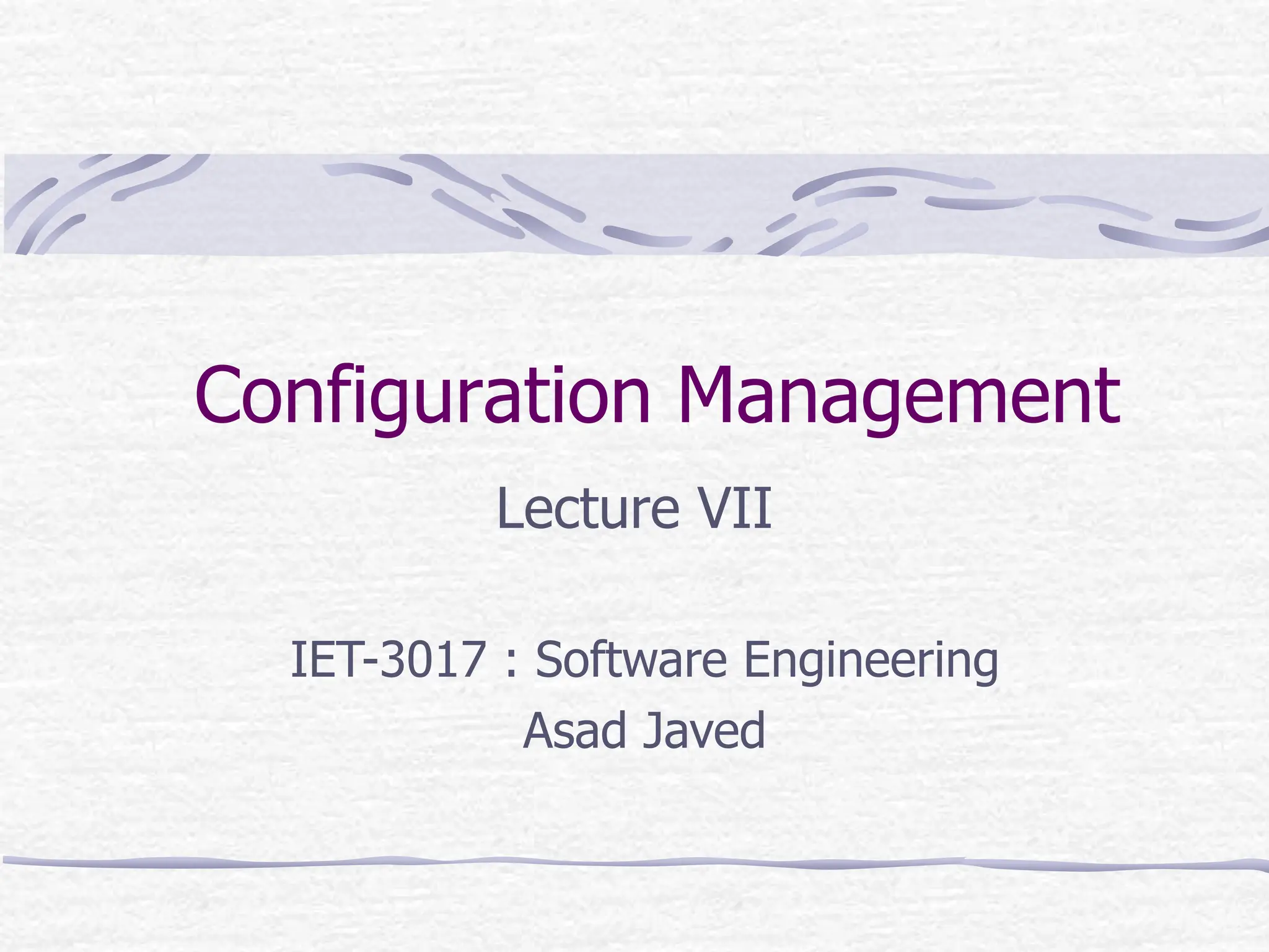 Configuration management is a technique for identifying, organizing, and controlling modifications to software being built by a programming team. It involves identifying changes, monitoring and controlling changes, ensuring proper implementation of changes, auditing changes made, and reporting on changes. The key aspects of configuration management include identification and establishment of configuration items, version control, change control, configuration auditing, and reporting. Configuration management helps improve productivity, reduce errors, and ensure quality and stability by properly controlling and managing all software changes.