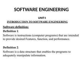 The document provides an introduction to software engineering, defining software as both instructions for desired functionality and a data structure for information manipulation. It outlines seven categories of software, including system software, application software, embedded software, and artificial intelligence software, and presents a generic process framework comprising five activities: communication, planning, modeling, construction, and deployment. Additionally, it discusses umbrella activities that manage project progress, quality, and risk throughout the engineering process.