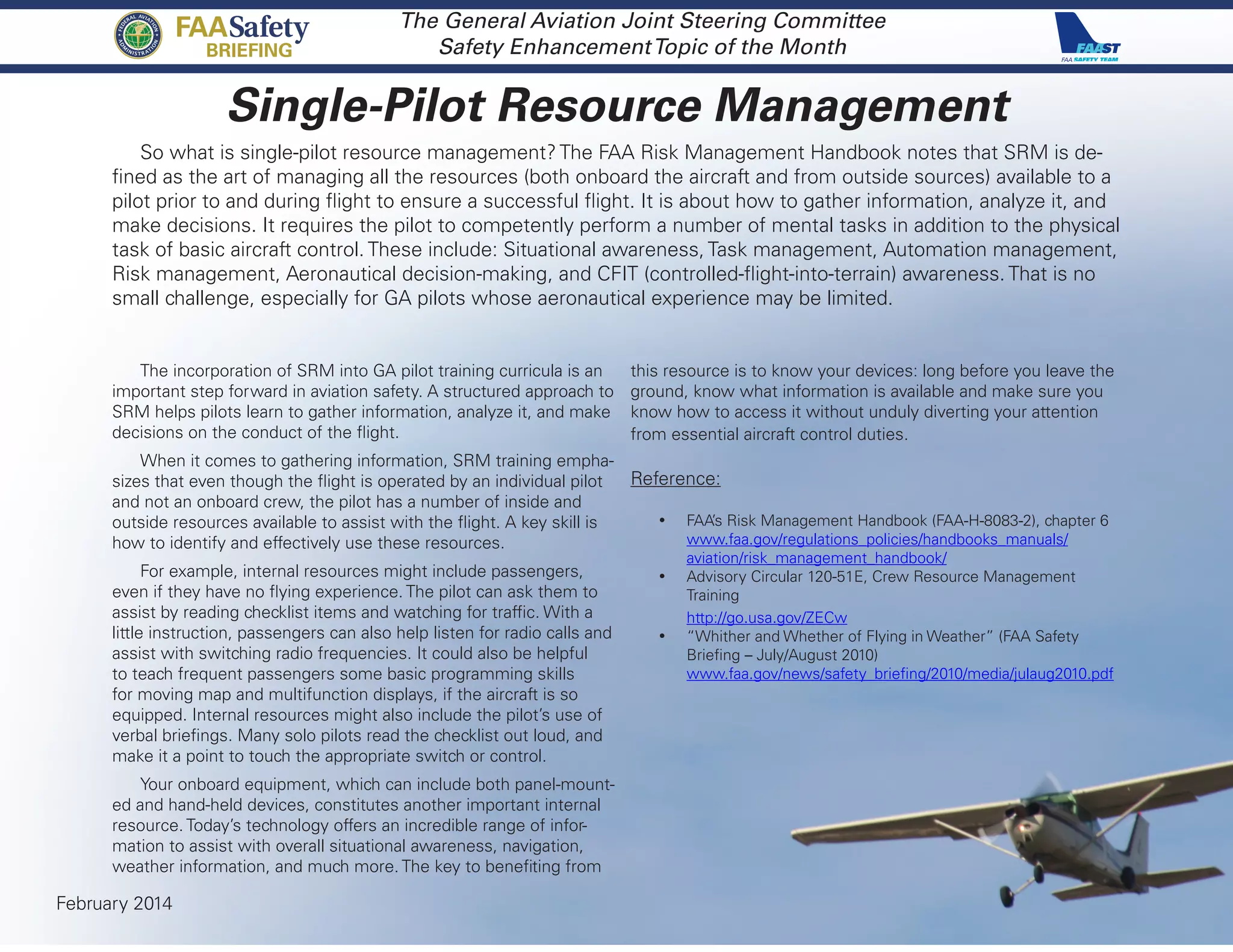 Single-Pilot Resource Management (SRM) is the skill of managing all resources available to a pilot during flight to ensure safety, including situational awareness and decision-making. It emphasizes the use of internal and external resources, such as passengers and onboard technology, to aid in flight operations. Incorporating SRM into general aviation training enhances pilots' ability to make informed decisions and improve overall aviation safety.