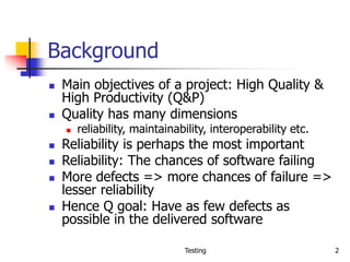 The document discusses various techniques for software testing including black box testing, equivalence partitioning, boundary value analysis, cause-effect graphing, pairwise testing, and special case testing. The goal of testing is to identify defects by designing test cases that are most likely to cause failures and reveal faults in the software.