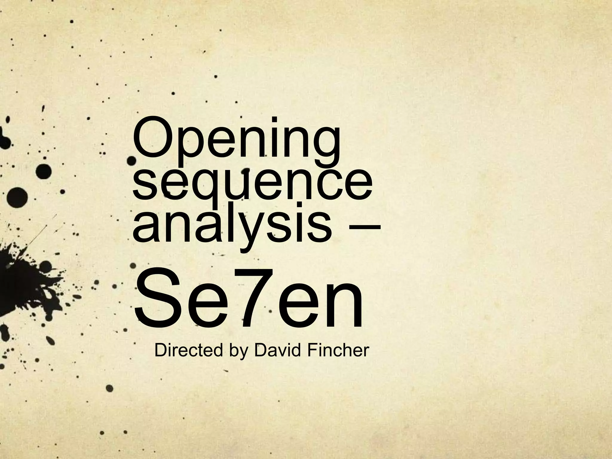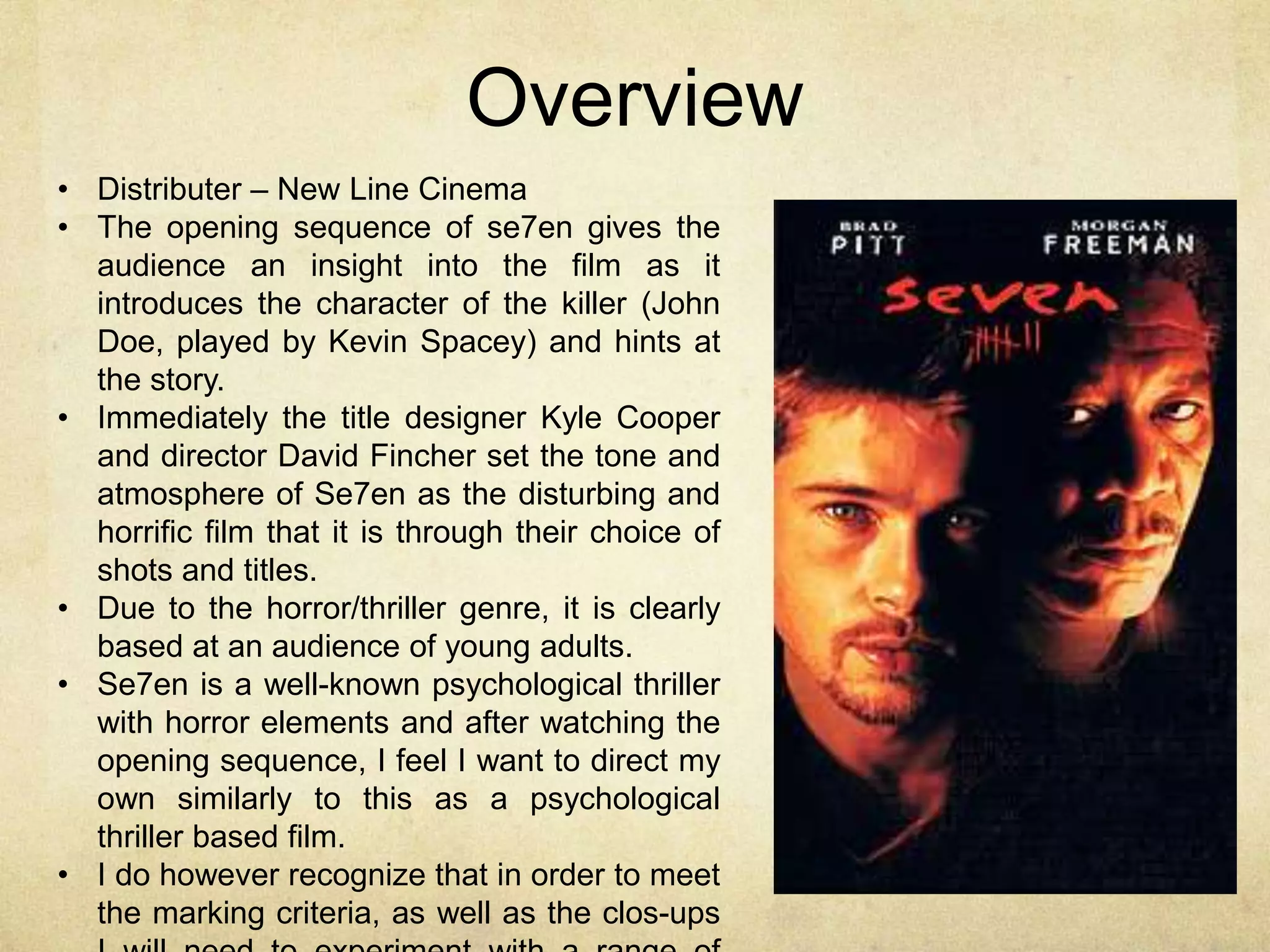 The opening sequence of Se7en, directed by David Fincher, introduces the killer John Doe through disturbing close-up shots and unsettling imagery set to a gritty score. The dark color palette, flashing images, and disorienting editing aim to put viewers on edge and hint at the psychologically thrilling and horrific story to come. Specific techniques like close-ups, unusual mise-en-scene elements, and minimal character shots are analyzed for their ability to build tension and intrigue the target adult audience.