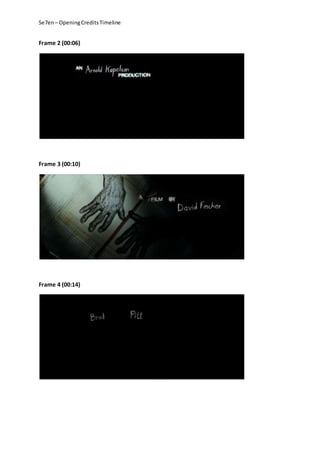 The document lists the opening credits timeline for the film Se7en over two frames. It shows the credits appearing from 00:03 to 00:53, crediting the film studio, producer, director, main actors Brad Pitt, Morgan Freeman, Gwyneth Paltrow, and supporting actors.
