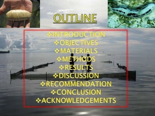 This study focused on observing the spawning behaviors and months of spawning of sea cucumbers in Kavieng, New Ireland Province. A pen was constructed to house and observe 7 species of sea cucumbers. Data on circumference, length, and percentage of each species was collected over two months. Spawning was observed in June when water temperature was 30.9°C. The objectives of measuring growth rates and larvae specimens were not fully achieved due to limitations of resources and time. More research is needed to improve scientific understanding of sea cucumbers and marine ecosystems in PNG.