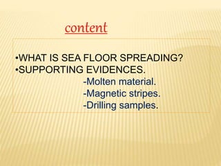 This document summarizes a seminar on sea floor spreading presented by Rimita Tikader. It describes how in the 1950s, scientists mapped the mid-ocean ridge using sonar and discovered the ocean floor was not flat, peaking their curiosity. In the 1960s, Harry Hess proposed that hot, less dense material rises at the mid-ocean ridge, flows sideways, and carries the sea floor away from the ridge, creating new sea floor. This process is called sea floor spreading. Supporting evidence includes samples of molten rock and magnetic stripes on the sea floor that support the theory.