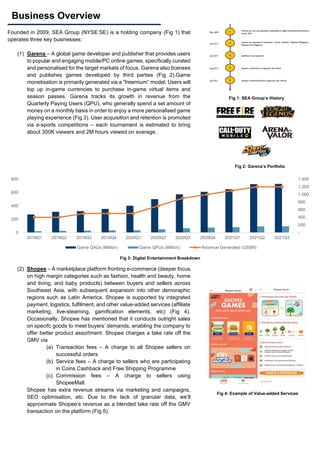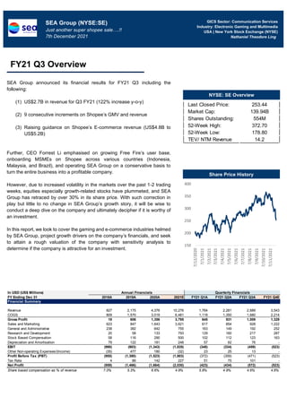 SEA Group reported strong financial results for Q3 FY21, with 122% revenue growth. The CEO emphasized growing Free Fire's user base and onboarding more MSMEs to Shopee across countries. However, SEA Group's share price has dropped over 30% recently due to market volatility. The report analyzes SEA Group's gaming and e-commerce industries, projects financial growth drivers, and conducts a valuation analysis to determine if SEA Group is attractive for investment.