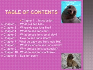 This document provides an overview of sea lions. It discusses that sea lions are mammals that live in colonies near oceans and shores or in zoo pools. They eat fish and squid. During the day, sea lions spend their time eating, swimming, sleeping, and interacting with zookeepers. They can sleep on land or floating in water. Baby sea lions are called pups and look similar to adults but are smaller. Sea lions make various sounds like roars, honks, and barks. They are special because they are good swimmers and can walk on land using their flippers. Sea lions have brown fur, four flippers, and whiskers.