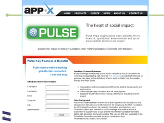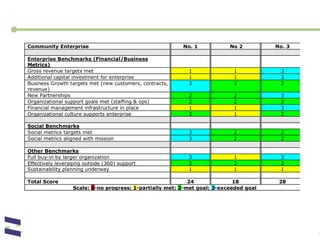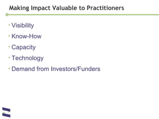The document discusses challenges and opportunities around measuring social impact for social enterprises. It describes different approaches to social impact measurement including SROI (Social Return on Investment) and impact dashboards. The document also presents examples of how organizations can communicate their social impact performance through standardized profiles that integrate financial and qualitative impact metrics. Developing better social impact data and measurement is presented as key to connecting capital to outcomes and facilitating social change.