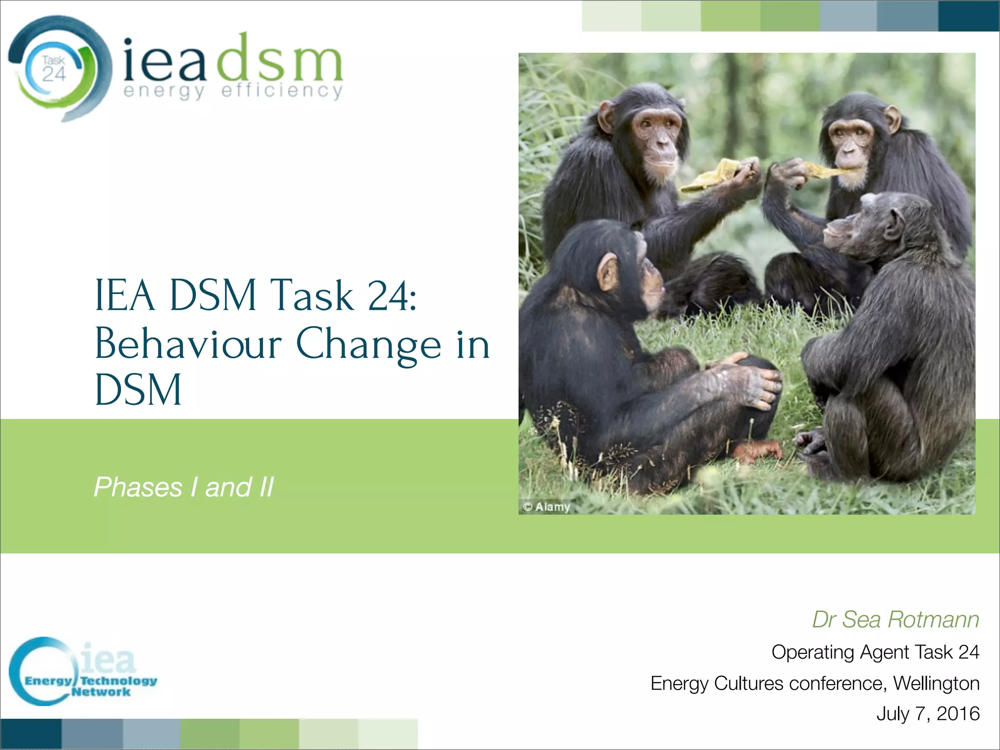 IEA DSM Task 24 involved multiple participating countries working together over two phases to research and promote best practices in behavior change for demand-side management (DSM) of energy. Phase I from 2012-2015 included case studies, workshops, publications and an online platform. Phase II aims to provide tools and guidance to "behavior changers" through understanding practices, developing interventions and standardizing evaluation metrics beyond just kilowatt hours. The task takes a holistic approach focusing on human needs and behaviors within the energy system and emphasizes cross-sector collaboration to drive system-wide changes.