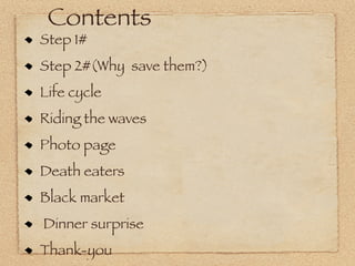 This document discusses sea turtles and provides steps on how to help save them from endangerment. It describes their life cycle and predators, noting that humans are their main threat due to activities like littering and the black market trade of turtle shells and meat. The guide urges readers not to buy turtle shell products and to avoid littering in order to help protect the turtles and their habitat.