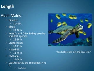 The document discusses various facts about sea turtles, including their sizes, weights, lifespans, diets, habitats, and natural predators. It notes that several sea turtle species are endangered due to threats such as fishing nets, boats, light pollution, and loss of nesting beaches. The document urges human actions like turning off lights near nests and reducing pollution to help protect vulnerable sea turtle populations.