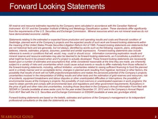 The corporate presentation provides an overview of Seabridge Gold and its key projects. It summarizes that Seabridge has proven and probable gold reserves of 44.7 million ounces and copper reserves of 10 billion pounds. It also notes that Seabridge has a low valuation of $8 per ounce of gold reserves and that its projects have low political risk as they are all located in Canada. A significant portion of the presentation focuses on the KSM project, which it describes as the largest undeveloped gold and copper project in the world based on reserves. It provides details on KSM's favorable logistics, large reserve size, and preliminary feasibility study outlining an long life mine plan with attractive economics.