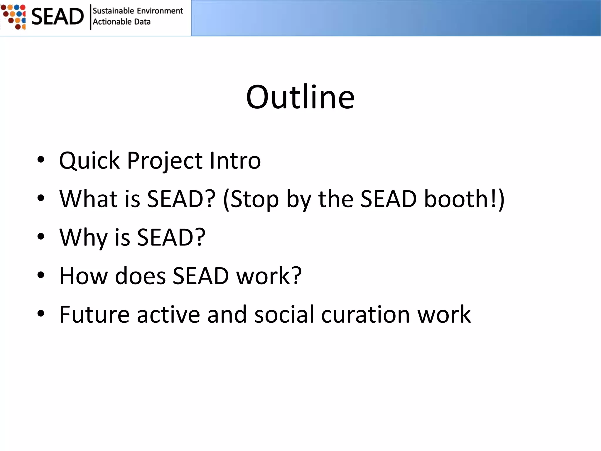 This document discusses the Sustainable Environment Actionable Data (SEAD) project, which aims to lower the costs and increase the value of data curation through a data lifecycle approach. SEAD provides lightweight data services to support sustainability research, including secure project workspaces, active and social curation tools, and integrated lifecycle support for data from ingest to long-term preservation. By leveraging technologies like Web 2.0 and standards, SEAD simplifies and automates curation processes using metadata captured from data producers and users. This allows curation activities to begin earlier in the data lifecycle and be distributed across researchers and curators.