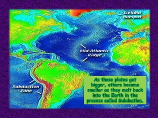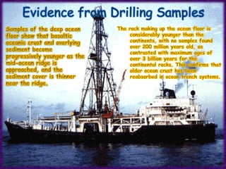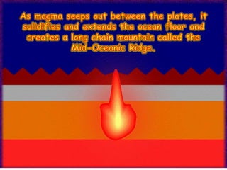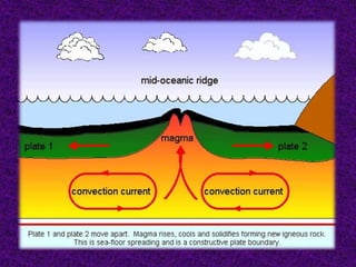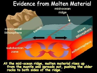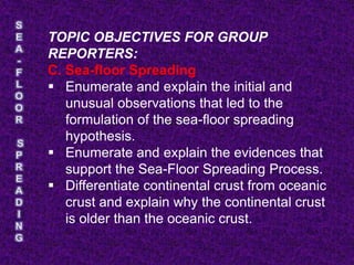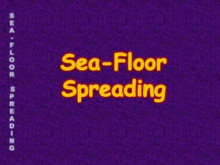 1. The document discusses sea-floor spreading, which is the process where new oceanic crust forms at mid-ocean ridges as tectonic plates move away from each other.