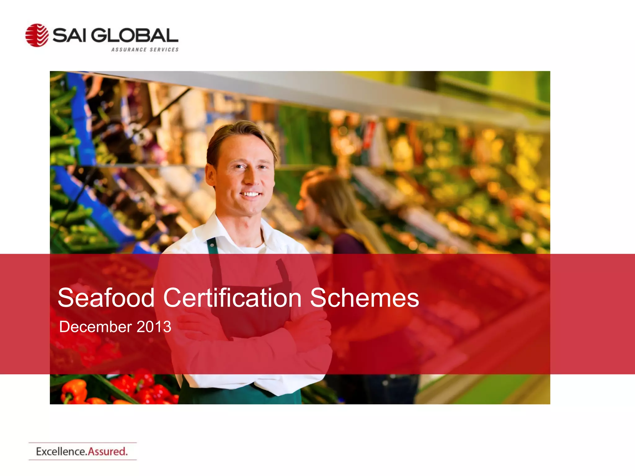 The document is a presentation on seafood certification schemes, led by Cormac O'Sullivan, who has extensive experience in aquaculture and seafood standards. It covers the growth of aquaculture, the environmental and social issues associated with it, and various certification schemes aimed at ensuring quality, safety, and sustainability. Notable topics include the Global Aquaculture Alliance's Best Aquaculture Practices standards, emphasizing community rights, environmental impact, and animal welfare.