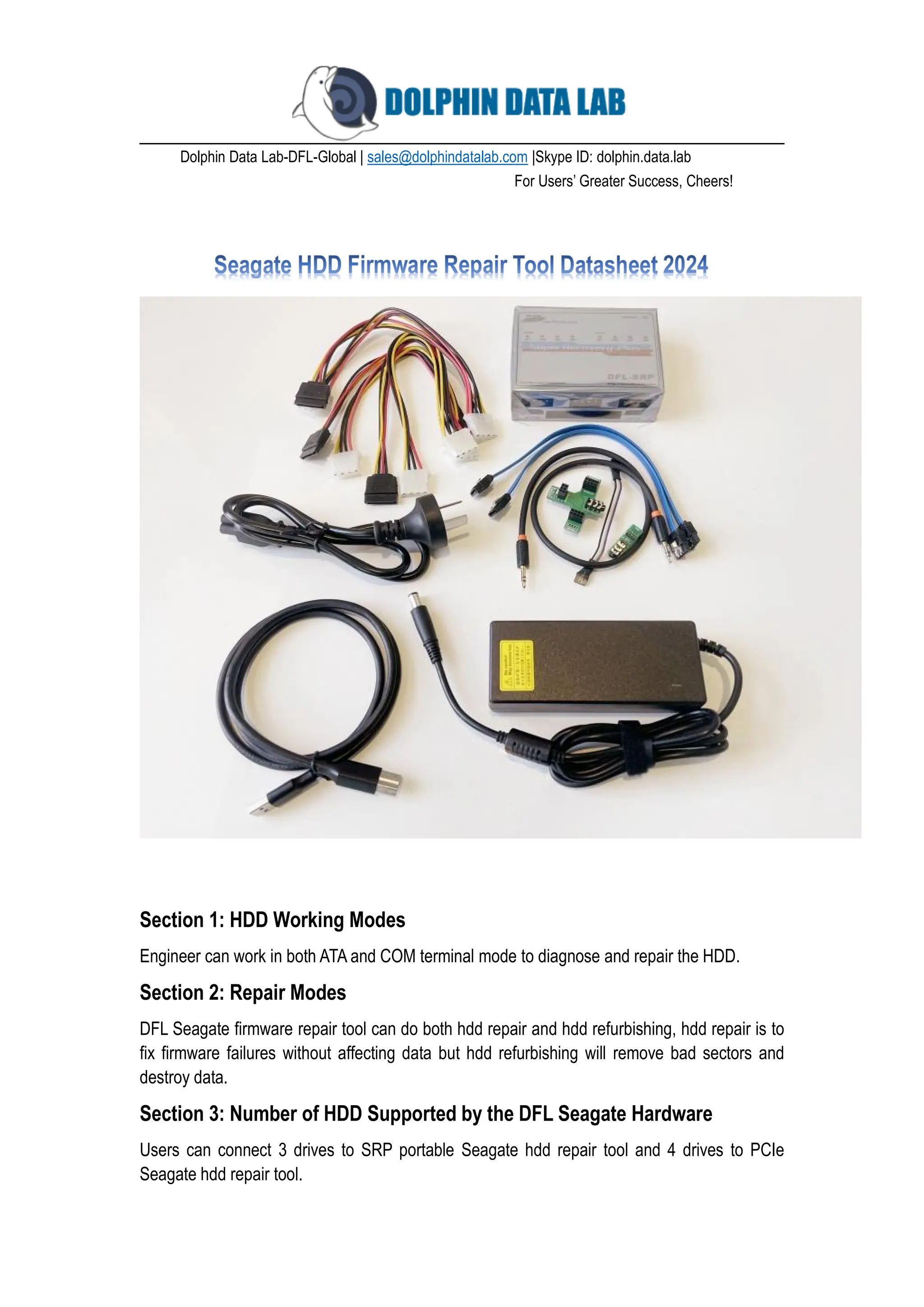 This document provides information about Dolphin Data Lab's HDD repair tools. It describes the tool's various modes for diagnosing and repairing HDDs, including repair, refurbishing, and firmware modes. It also lists the types of Seagate HDD failures the tools can fix, such as bad sectors, locked drives, and firmware issues. Sections cover operating systems supported, advantages over competitors, common firmware fixes, and detailed ROM, service area, RAM, and defect operations.