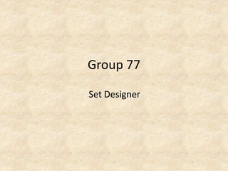 The document outlines a set design proposal for Anton Chekhov's play "The Seagull". It recommends constructing a 2D wooden model of Sorin's estate to allow for quick scene changes. The house should be double-sided so both interior and exterior scenes can be performed. Furniture like tables and chairs should have a hand-built, rustic look to match the 1900s Russian setting. Backgrounds will be printed on curtains to depict the pond and trees. The overall design aims to create a realistic yet easily transformable setting through movable wooden pieces painted in an autumn color palette.