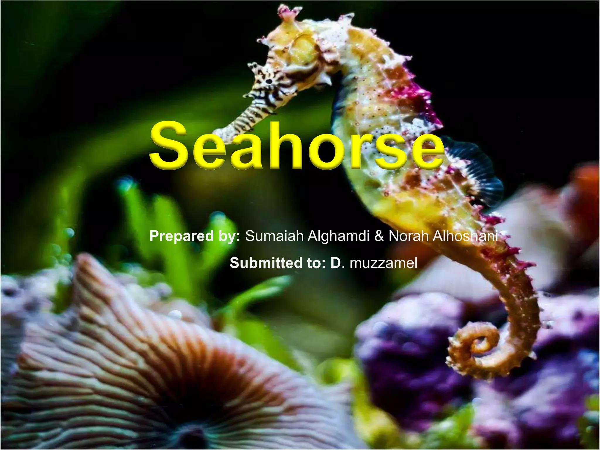 Seahorses are small fish that live in coastal waters around the world. They have a horse-like head and curled tail, and males carry fertilized eggs in a brood pouch before giving birth. Seahorses come in various colors and can change their color to camouflage with their habitat. They eat small shrimp, fish, and plankton. Male seahorses are responsible for pregnancy and giving birth to live young after a 2-4 week gestation period. Seahorses face threats from predators like sharks and fisheries, and some species are endangered.