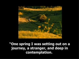 This document discusses how nature can reveal signs of God. It describes how seeing a yellow buttercup flower on a journey caused the author to reflect on how all things of that species signify the seal of the Most Merciful One, as a seal denotes the author of a letter. Further, the hillside covered with these flowers takes on the form of a letter from the flower's Maker. All things prove their Creator through their impress and art, ascribing themselves to a Single One of Unity.