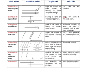 This document discusses different types of seams used in garment construction. It begins by defining a seam as the place where two pieces of fabric are joined together with stitches. It then provides details on 7 common types of seams - superimposed seam, lapped seam, bound seam, flat seam, decorative seam, edge neatening seam, and a seam similar to a lapped seam. For each seam type, it provides a definition and examples of typical usages. It concludes by discussing best practices for seams and factors that can affect the appearance of a seam.