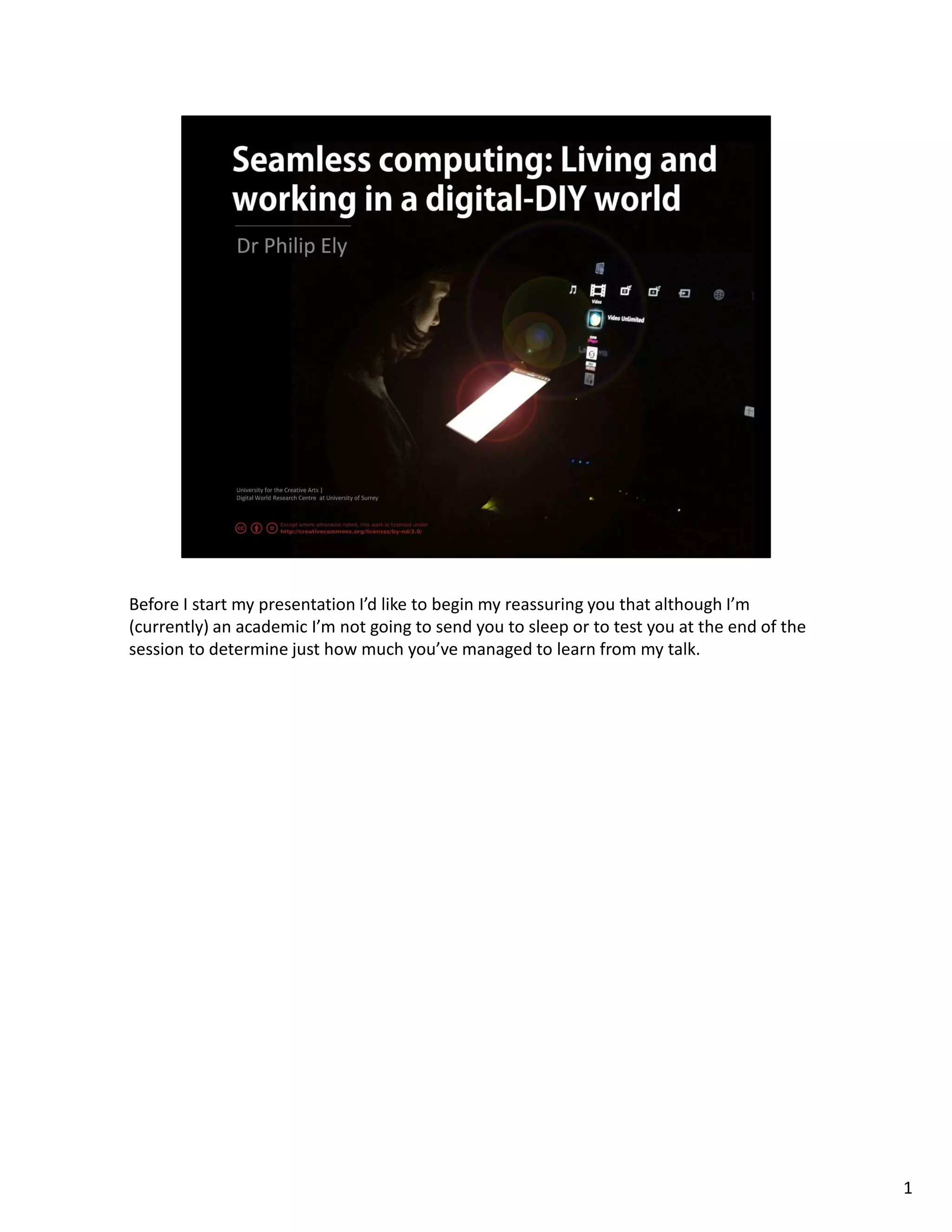 The speaker, an academic and former director of digital media, discusses the realities of living and working with technology in a digital-diy world, emphasizing the gap between early visions of seamless computing and current experiences filled with complexity. He introduces the concept of 'domestication of technology,' outlining the stages through which technologies are integrated into daily life, and critiques the ad-hoc nature of how tech enters homes and workplaces. By considering ecological and practice-based frameworks, he suggests ways to improve technology design and user interactions in contemporary settings.
