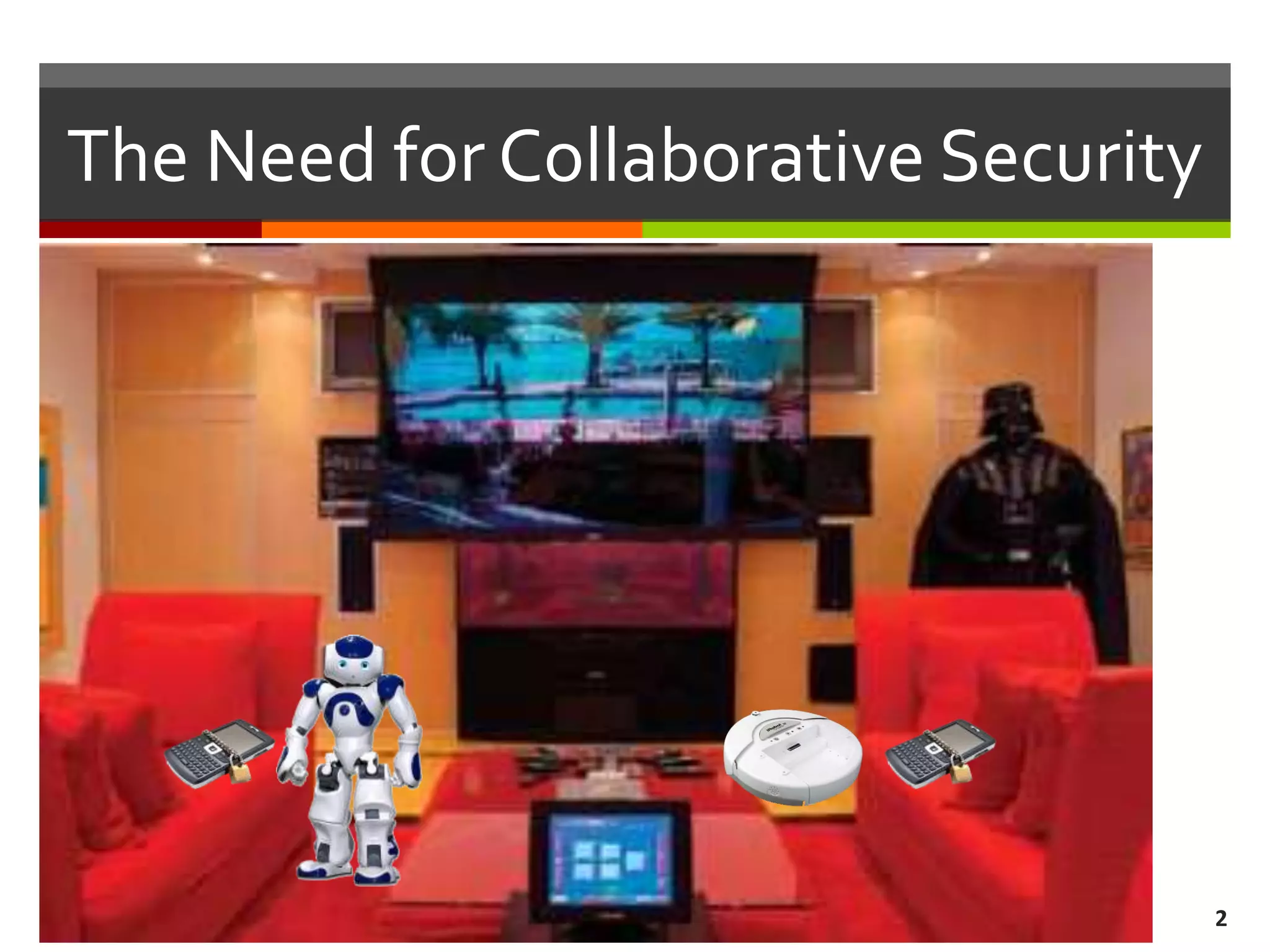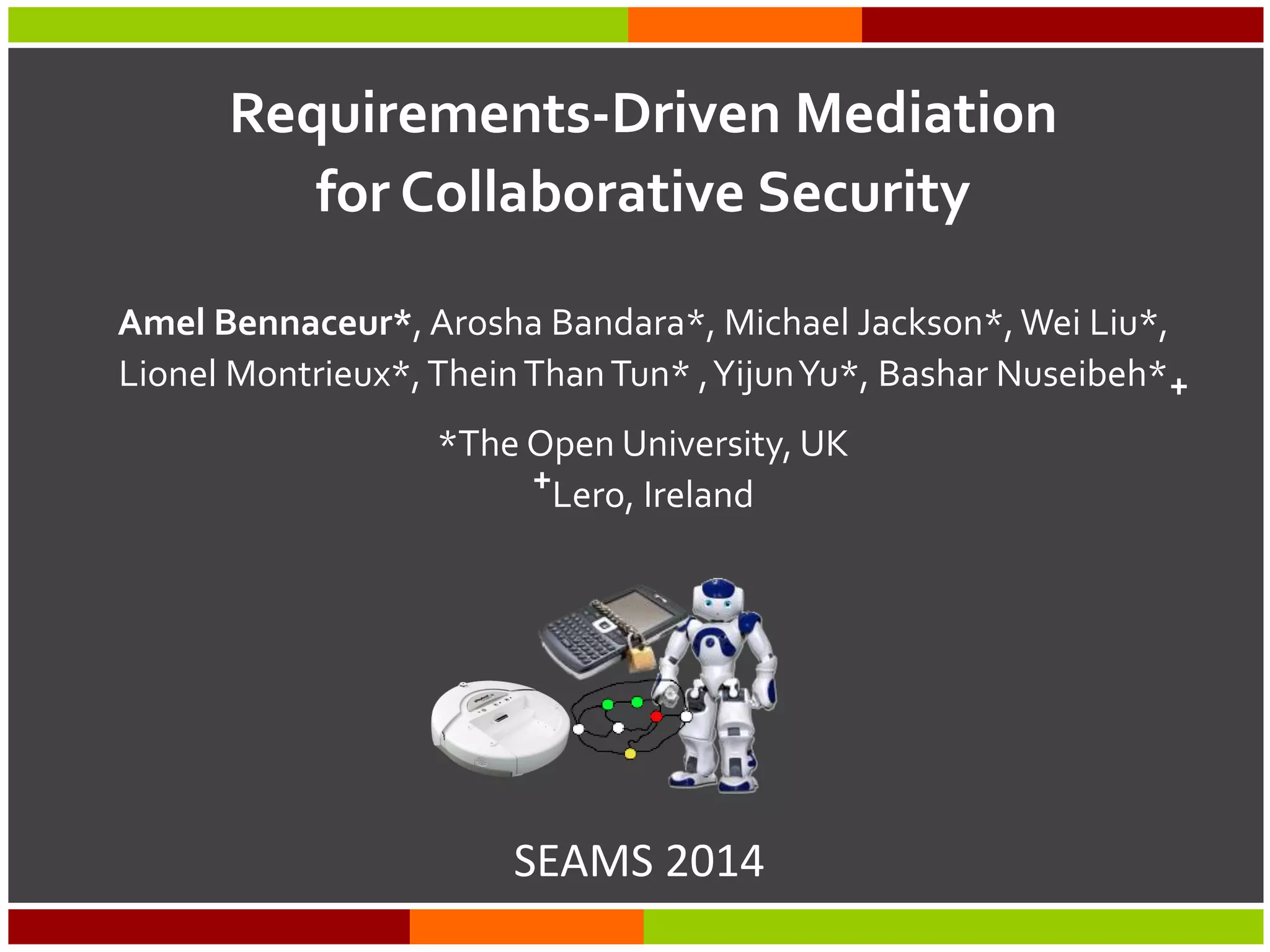 The document discusses the concept of requirements-driven mediation for collaborative security in complex, software-intensive systems. It emphasizes the need for multiple components to work together to adapt to security challenges and changes in the environment, highlighting features such as mediator selection and verification of collaboration to ensure security requirements are met. The paper outlines a research agenda focused on selection, mediation, and verification of security capabilities in collaborative environments.
