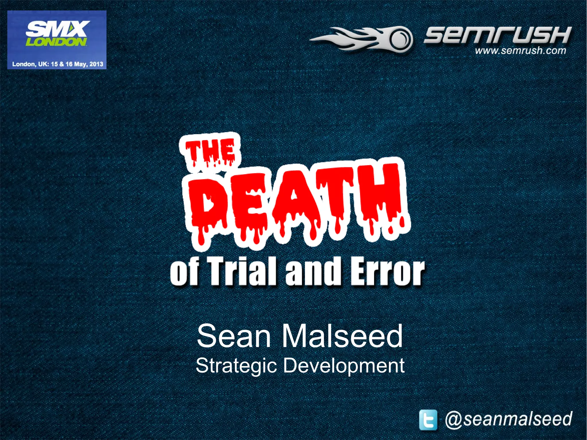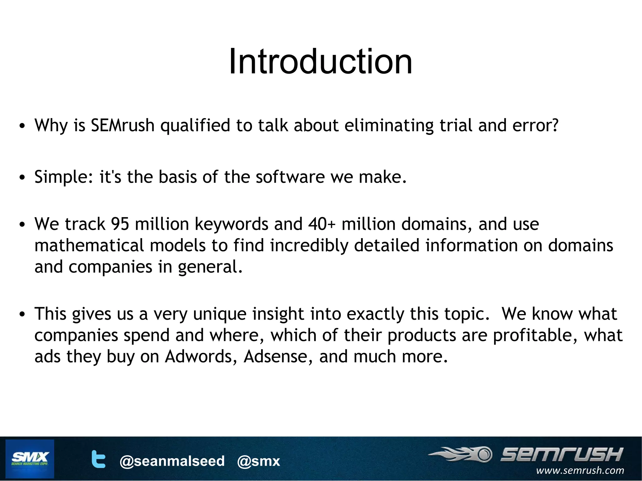 SEMrush tracks 95 million keywords and 40+ million domains to gain insights into digital marketing strategies. The document recommends identifying real competitors through tools like SimilarSites.com and analyzing competitors' paid keyword strategies using SEMrush, KeywordEye.co.uk, and KeywordToolDominator.com to build an effective keyword list. It emphasizes using exact match keywords and considering transactional versus informational intent to minimize wasted spending through trial and error.