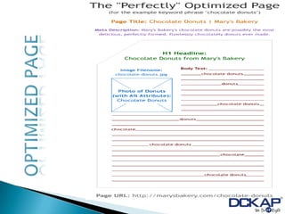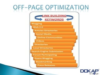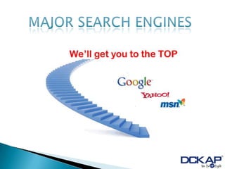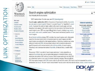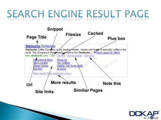 A search engine is designed to search for information on the World Wide Web by using a spider to index web pages and store them in a database. The search engine then uses algorithms to find matching documents for search queries and displays results according to relevance. SEO, or search engine optimization, is the process of improving the visibility of a website in un-paid search engine results. It involves on-page and off-page optimization techniques to increase search engine rankings and attract relevant traffic. Common metrics for measuring SEO success include increased keyword rankings, website traffic, and revenue.