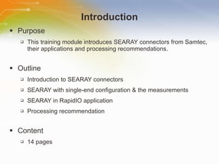 SEARAY is a high density, high speed board-to-board interconnect system from Samtec with up to 500 I/Os and 1.27mm pitch. It can be configured for single-ended or differential signaling with performance up to 10.5GHz. The document discusses SEARAY's applications in RapidIO and recommends a minimum stencil thickness of 0.005" for processing.