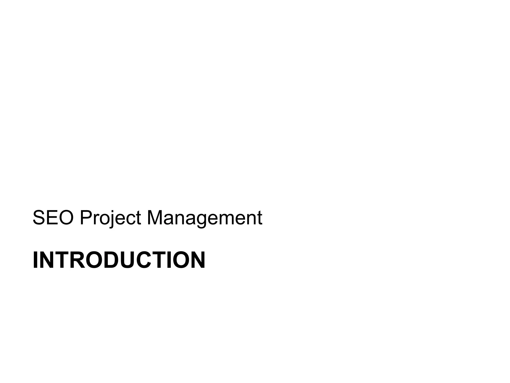 This document discusses search engine optimization (SEO) project management. It recommends embedding SEO into marketing strategy by choosing target keywords and metrics. It also suggests planning SEO programs by scoping the work, setting goals and benchmarks. Finally, it discusses making SEO operational by training teams, centralizing keyword management, and using metrics and scorecards to monitor and improve performance. The overall message is that SEO requires an organized, cross-functional project management approach.